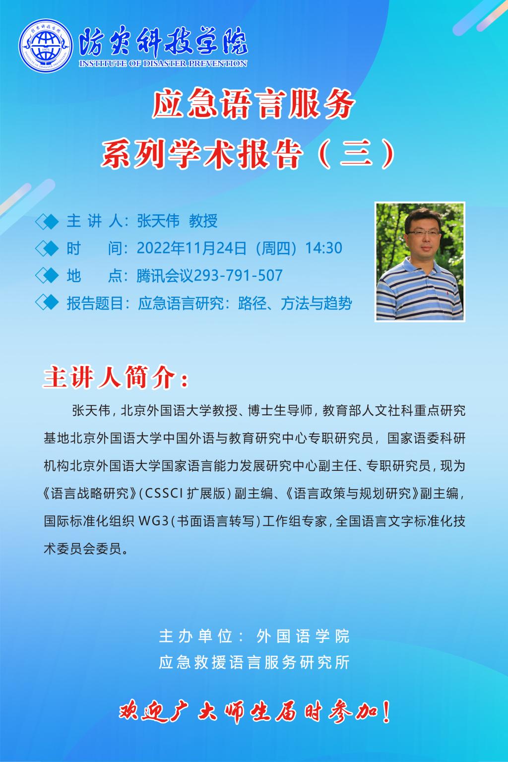 为提高我院师生应急语言服务专业及学术水平,我院将于2022年11月24日下午14:30邀请北京外国语大学张天伟教授做题为“‘应急语言服务’概略”的学术报告。欢迎广大师生参加,详情见海报。