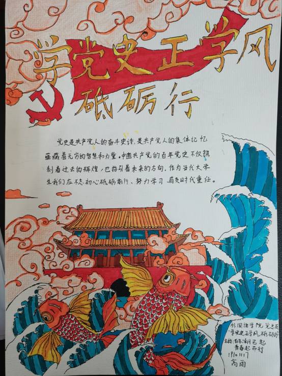 19101117高雨:这幅手抄报是由党徽,海浪,鲤鱼,天安门等元素构成,“海浪”代表时代浪潮,“鲤鱼”代表中国青年,寓意:在党的领导下,中国青年要学习党史,以史为鉴,抓住时代机遇,乘风破浪。
