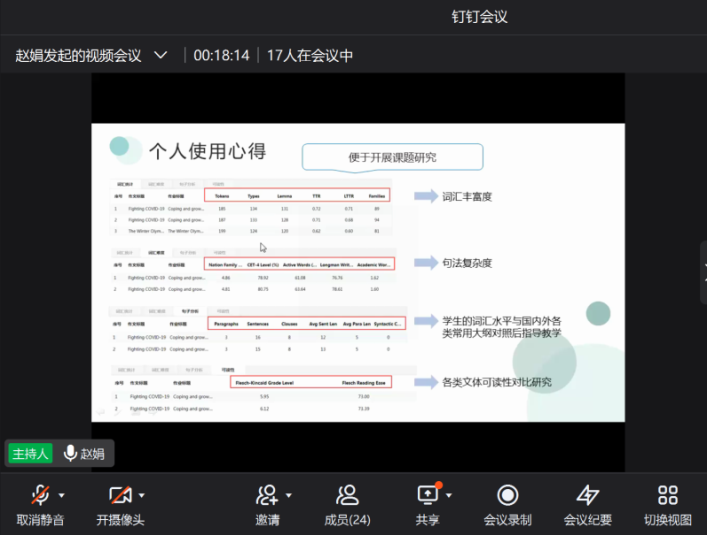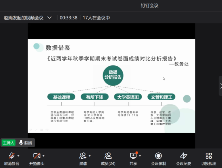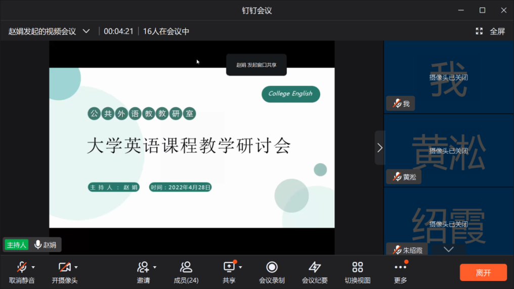 4月28日,我院公共外语教研室线上召开2021-2022学年春季学期大学英语课程教学研讨会。本次教学研讨会由教研室主任赵娟主持,教研室全体教师参加,学院副院长韩红梅参加会议。