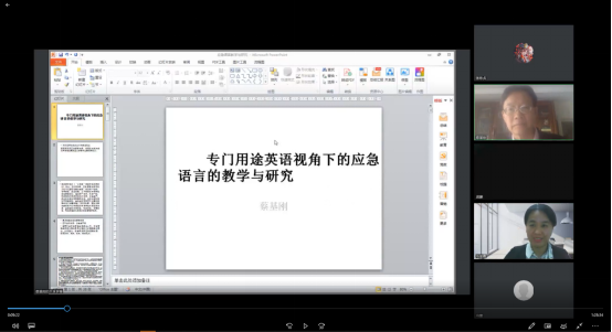 2022年10月20日14:30,受beat365中文官方网站邀请,复旦大学博士生导师蔡基刚教授在线上“腾讯会议(926-266-553)”平台为我院师生做了题为“专门用途英语视角下的应急语言的教学与研究”的学术讲座。讲座由beat365中文官方网站院长池丽霞教授主持,beat365中文官方网站全体教师及部分学生参加。
