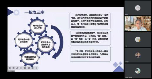 王教授对于国家应急语言服务理论研究和应用研究各方面的工作有全面和深入的思考。讲座中,王教授首先从应急语言服务的理念“平时备急、急时不急”入手,对国家应急语言服务的概念、服务对象、服务类型进行了介绍,并阐述了国家应急语言服务能力的现状、服务能力建设的五大目标、七大内容、应急语言服务教育体系的构建等方面进行了全面介绍。王教授启发参会师生从应急语言服务教育体系建设的理论体系、人才培养、课程教材、教育管理、教师培养、教育科研以及教育保障等体系建设方面发挥聪明才智,选定研究方向,不断深入挖掘,做出自己的成绩。