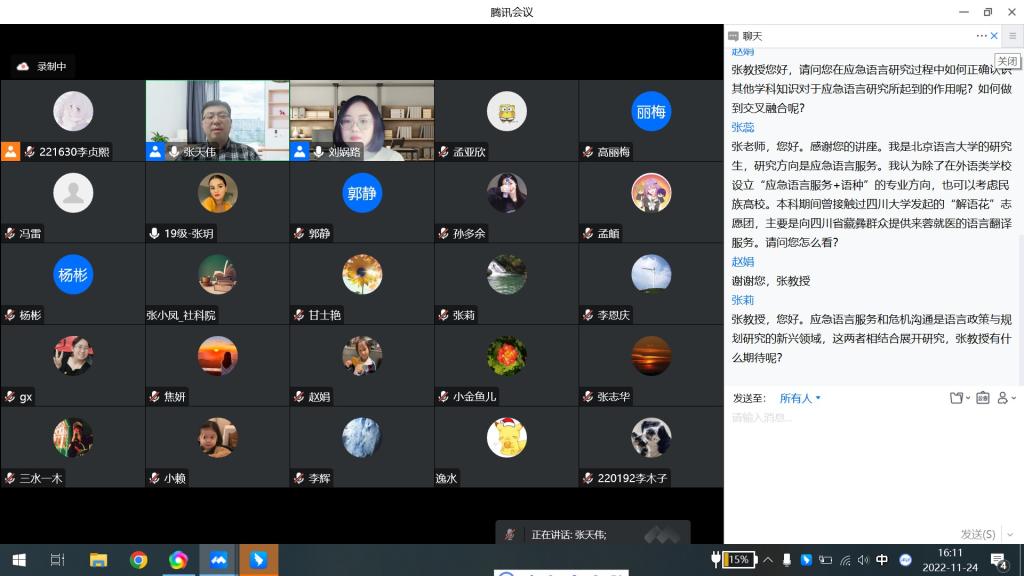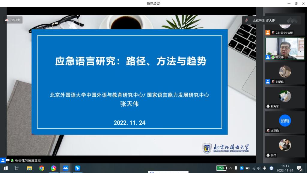 2022年11月24日14:30,受beat365中文官方网站邀请,北京外国语大学博士生导师张天伟教授在线上“腾讯会议(293-791-507)”平台为我院师生做了题为“应急语言研究:路径、方法与趋势”的学术报告,该报告是我院应急语言服务系列讲座之三。讲座由我院副教授刘娲路主持,beat365中文官方网站全体教师、部分学生聆听了报告,同时吸引了其他高校同仁及学生参会。