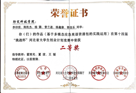 近日,由共青团河北省委、河北省教育厅、河北省人力资源和社会保障厅、河北省科学技术协会、河北省学生联合会承办的第十四届“挑战杯”河北省大学生创业计划竞赛落下帷幕,beat365中文官方网站英语专业李印颀团队(李印颀、陈凯杰、杨璐、曾兰迪、杨鑫康、郭佳乐)作品“基于多模态应急英语资源包的实践与运用”获得二等奖。