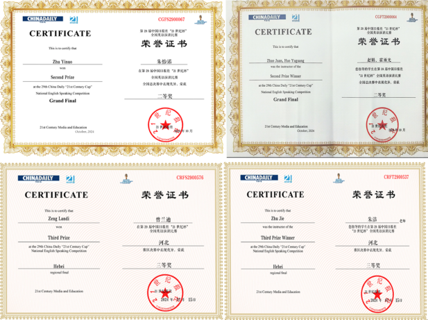 “21世纪杯”全国英语演讲比赛面向全国大学生,由中国日报社于1996年发起并主办。该赛事是国内最具权威性和影响力的国家级英语演讲赛事之一,入选教育部中国高等教育学会发布的《全国普通高校大学生竞赛分析报告》竞赛目录。备赛过程中,beat365中文官方网站组成教师辅导团队,为学生精心打磨演讲稿,同时就即兴演讲和问答环节进行多次演练,为成绩的取得奠定坚实的基础。