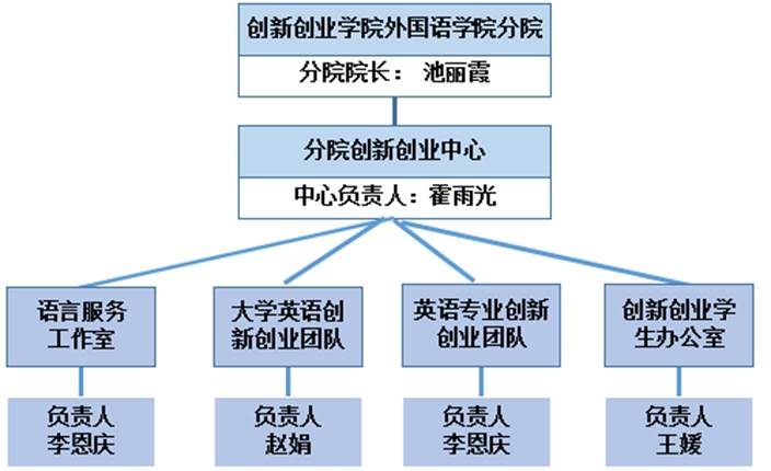 beat365中文官方网站创新创业分院成立于2020年10月,分院设置结构如下图所示,分院采用院长负责制,下设创新创业中心,设中心主任1名。创新创业中心下设2个创新创业团队,1个语言服务工作室和1个创新创业学生办公室,每个部门设负责人1名。beat365中文官方网站同时设有“应急语言服务研究所”,为提升学生的创新创业能力创造了良好的条件。分院的成立旨在深入贯彻落实国家有关创新创业教育文件的精神,加强beat365中文官方网站的创新创业与学科竞赛工作,开创创新创业教育的新模式,鼓励学生积极参与学科竞赛和创新创业竞赛和训练项目、申报创新研究课题、积极创业,将创新创业精神与意识的培养、创业就业的知识技能融会贯穿至通识教育、专业教育、创业就业核心教育的实践中,充分提高学生的专业能力,增强学生的实践能力,从而有效地促进学生的就业能力。